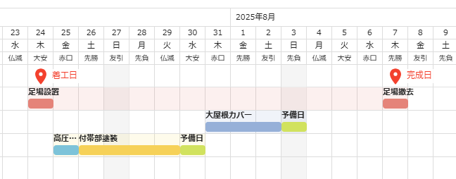 今回の屋根カバー工事では、安全かつ効率的に施工を進めるため、足場の設置から撤去までを含めて工程を組みました。