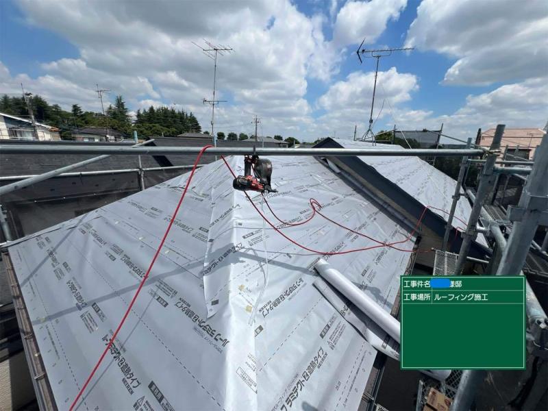 既存屋根の上に高耐久防水シートを敷き、防水層を確保します。雨漏りのリスクを徹底的に排除する工程です。