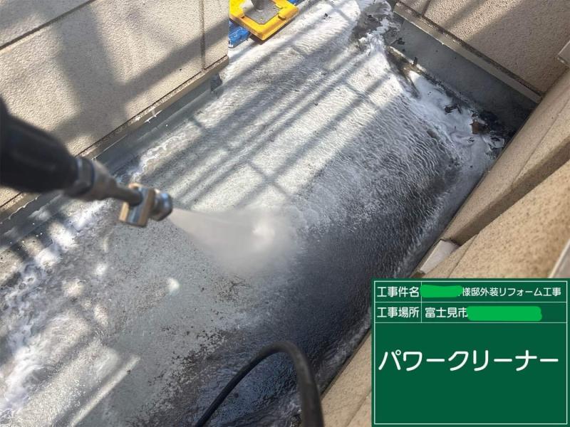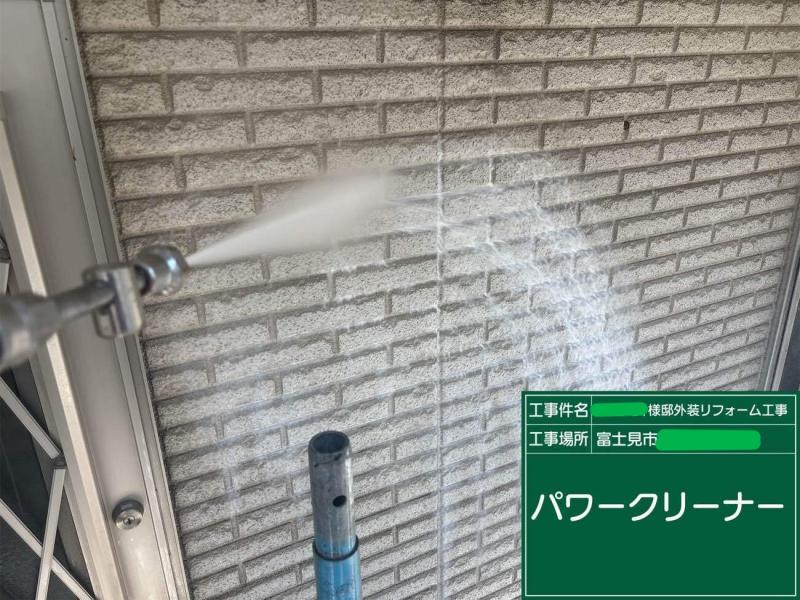 塗装前にはまず、外壁をきれいに洗浄することが重要です。今回は通常の高圧洗浄に加え、専用洗剤「ガイソーパワークリーナー」 を使用しました。