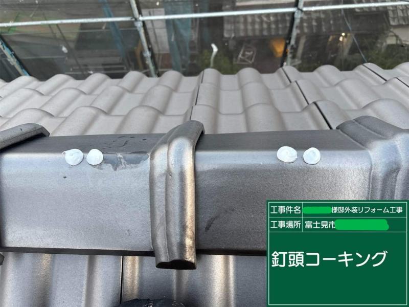 棟押さえの釘頭が浮き気味だったため、打ち直しのうえコーキングでしっかりと固定。釘の緩みやサビによる雨漏りリスクを抑えました。